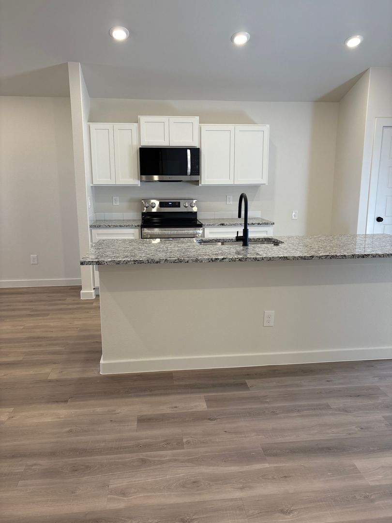 The primary suite provides a peaceful escape with a private bath and generous closet space, while the two additional bedrooms offer versatility for family members, guests, or a dedicated home office. The kitchen showcases modern cabinetry, ample prep space, and contemporary finishes that blend beauty with practicality. Energy-efficient construction and low-maintenance features ensure convenience and long-term value.