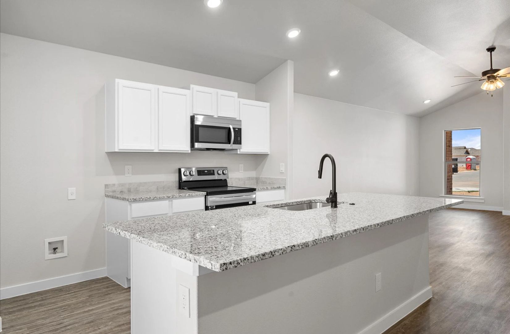 This inviting 3-bedroom, 2-bathroom home features an open floor plan with luxury vinyl flooring throughout, giving it a fresh and cohesive look. The spacious living area is ideal for relaxing or entertaining, with plenty of natural light that creates a bright, airy feel. The modern kitchen is a true highlight—complete with granite countertops, ample cabinet space, and quality appliances, including a microwave, stove, and dishwasher.