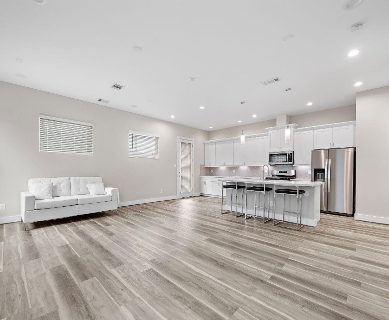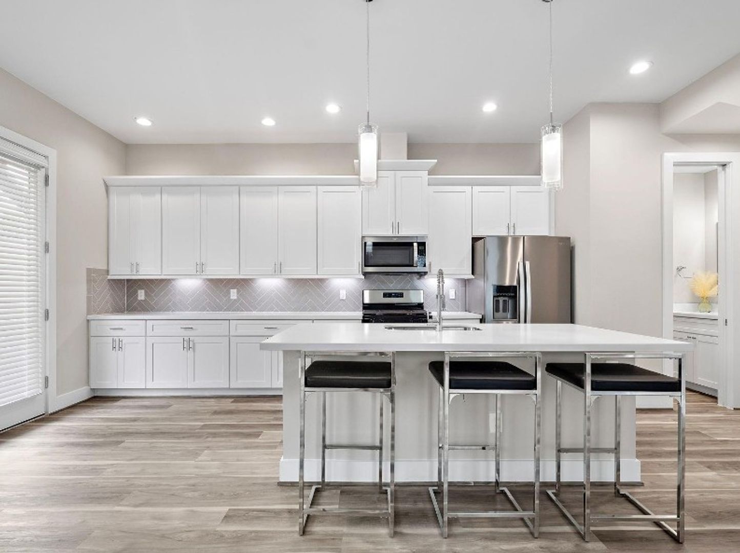Step inside to a bright open-concept floor plan with high ceilings and vinyl plank flooring throughout the main living areas. The spacious living and dining area flows seamlessly into a chef-inspired kitchen featuring sleek quartz countertops, a large island with seating, modern stainless steel appliances, and ample cabinet space—ideal for cooking, entertaining, or casual family gatherings.