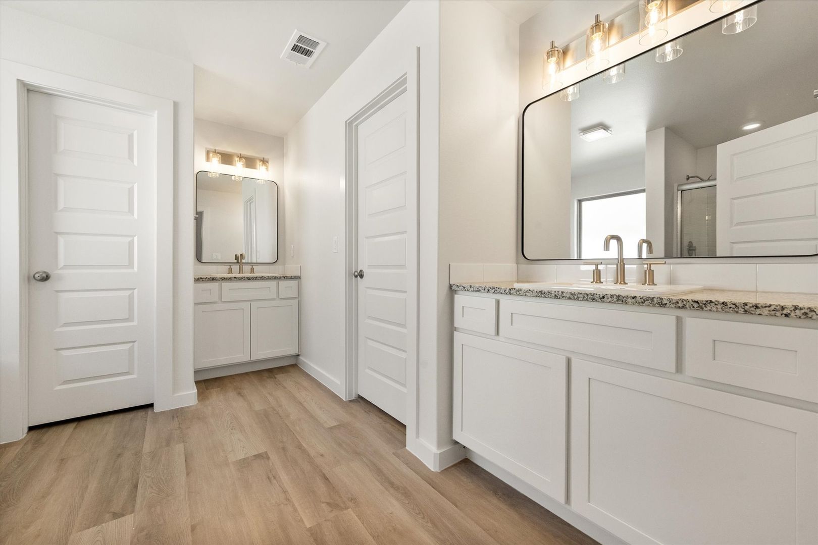 The primary suite offers a peaceful retreat with a private bath and roomy closet space, while the two additional bedrooms are ideal for children, guests, or a home office. Both bathrooms are tastefully designed and well-appointed for convenience and style.